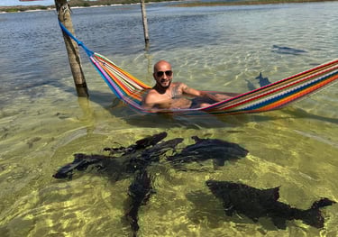 No caminho, fizemos uma parada na Lagoa dos Tambaquis, onde vivemos a experiência inesquecível de entrar na água com os peixes gigantes que chegam bem perto dos visitantes. Um momento divertido e único!